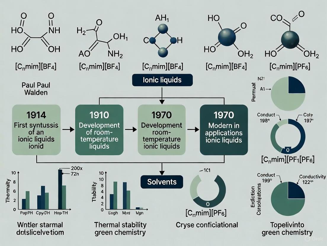The field of ionic liquids, now a major subject of study in modern chemistry, traces its origins to foundational work conducted over a century ago. While contemporary research produces thousands of papers annually, the initial discoveries that established this domain were isolated breakthroughs that went largely unnoticed for decades. This technical examination details the seminal contributions of Paul Walden and other early pioneers who first documented salts that remained liquid at low temperatures, establishing the fundamental principles that would later enable the diverse applications of ionic liquids in green chemistry, electrochemistry, and industrial processes. The historical development of these materials demonstrates how disparate research threads eventually converged to create a unified field characterized by intentional design of ionic systems with specific physicochemical properties [1] [2].